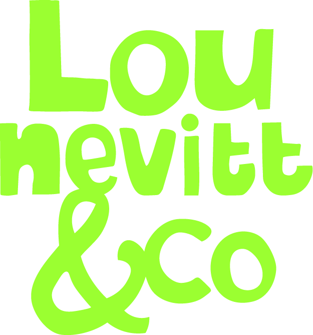 Een geïllustreerd logo met een eigenzinnig ontworpen font en een opvallend kleurenpalet benadrukt de eigenheid en het merkkarakter van Lou Nevitt & Co.